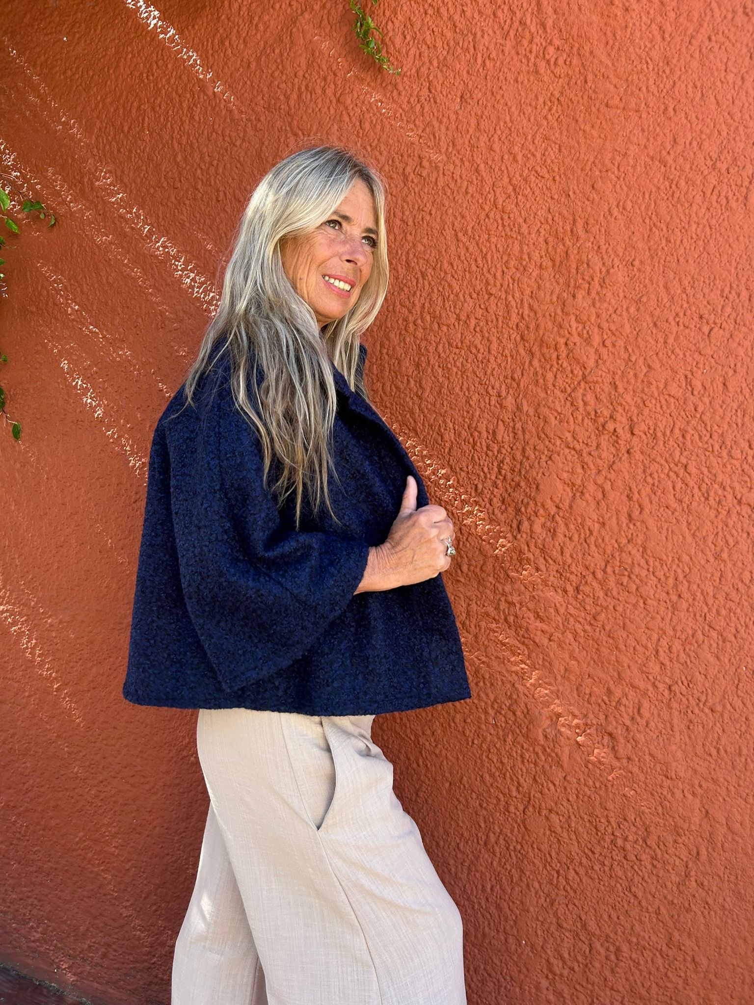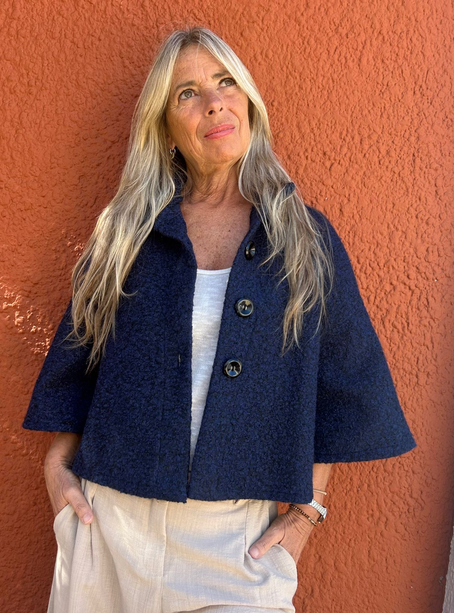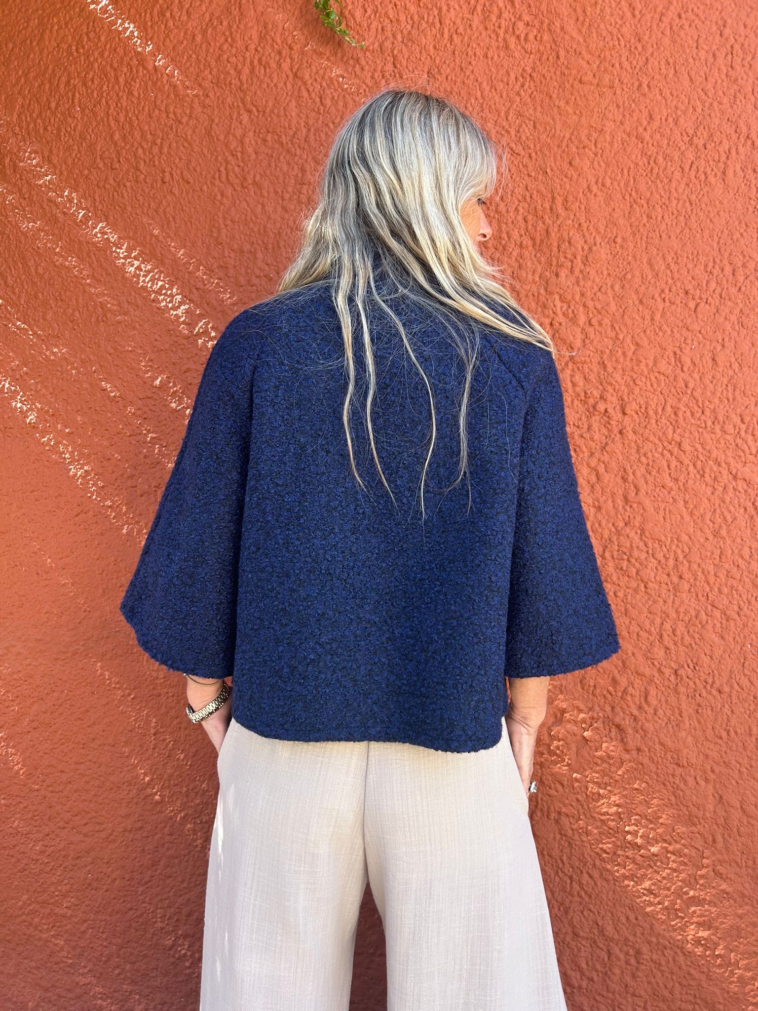 Capa corta de Bucle : color Azul. Talle único , se adapta según tus medidas al tener manga ramglan y corte en A . Una prenda liviana y a su vez abriga , ideal para looks de Pant anchos .