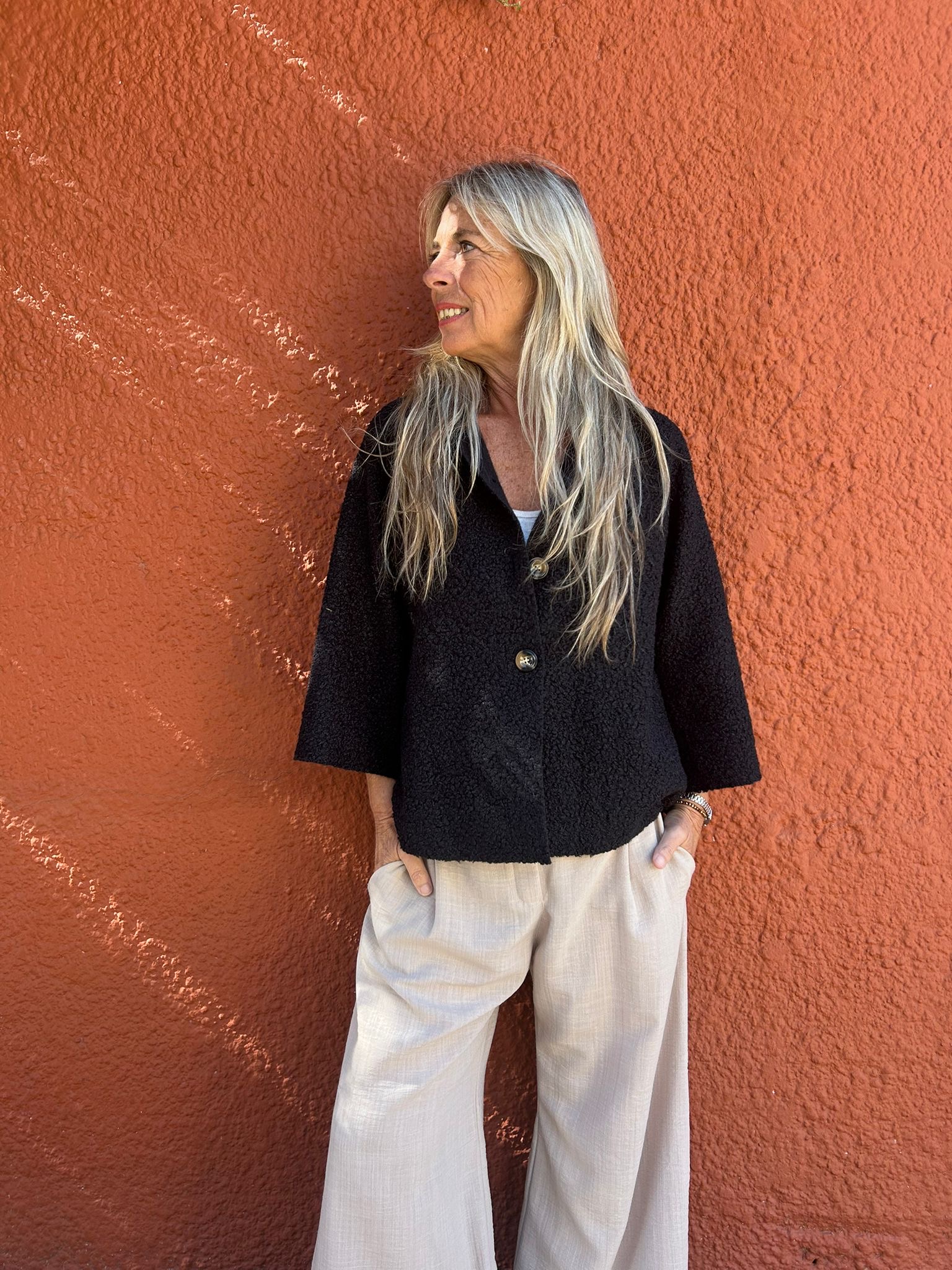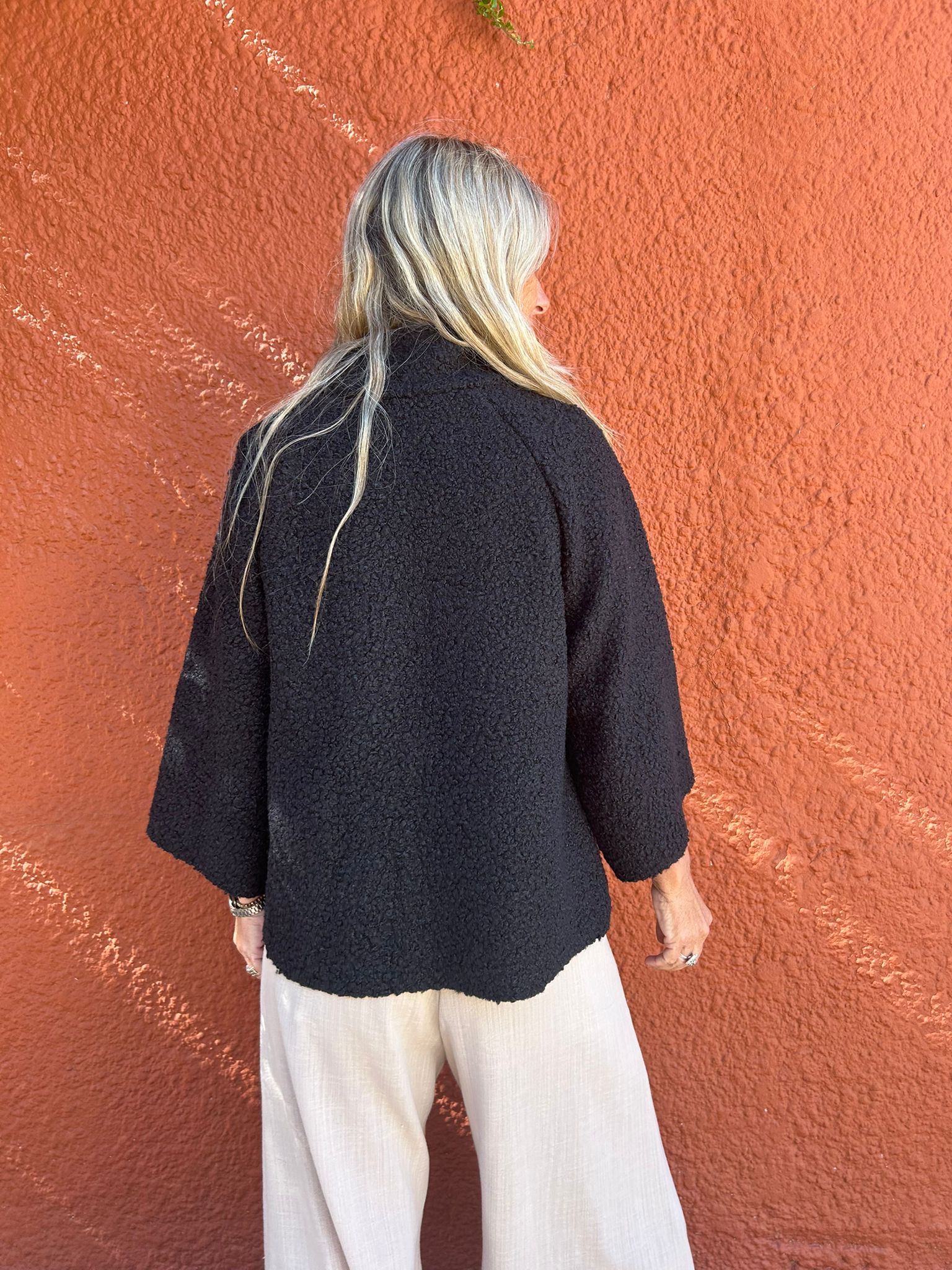 Capa corta de Bucle : color negro. Talle único , se adapta según tus medidas al tener manga ramglan y corte en A . Una prenda liviana y a su vez abriga , ideal para looks de Pant anchos .