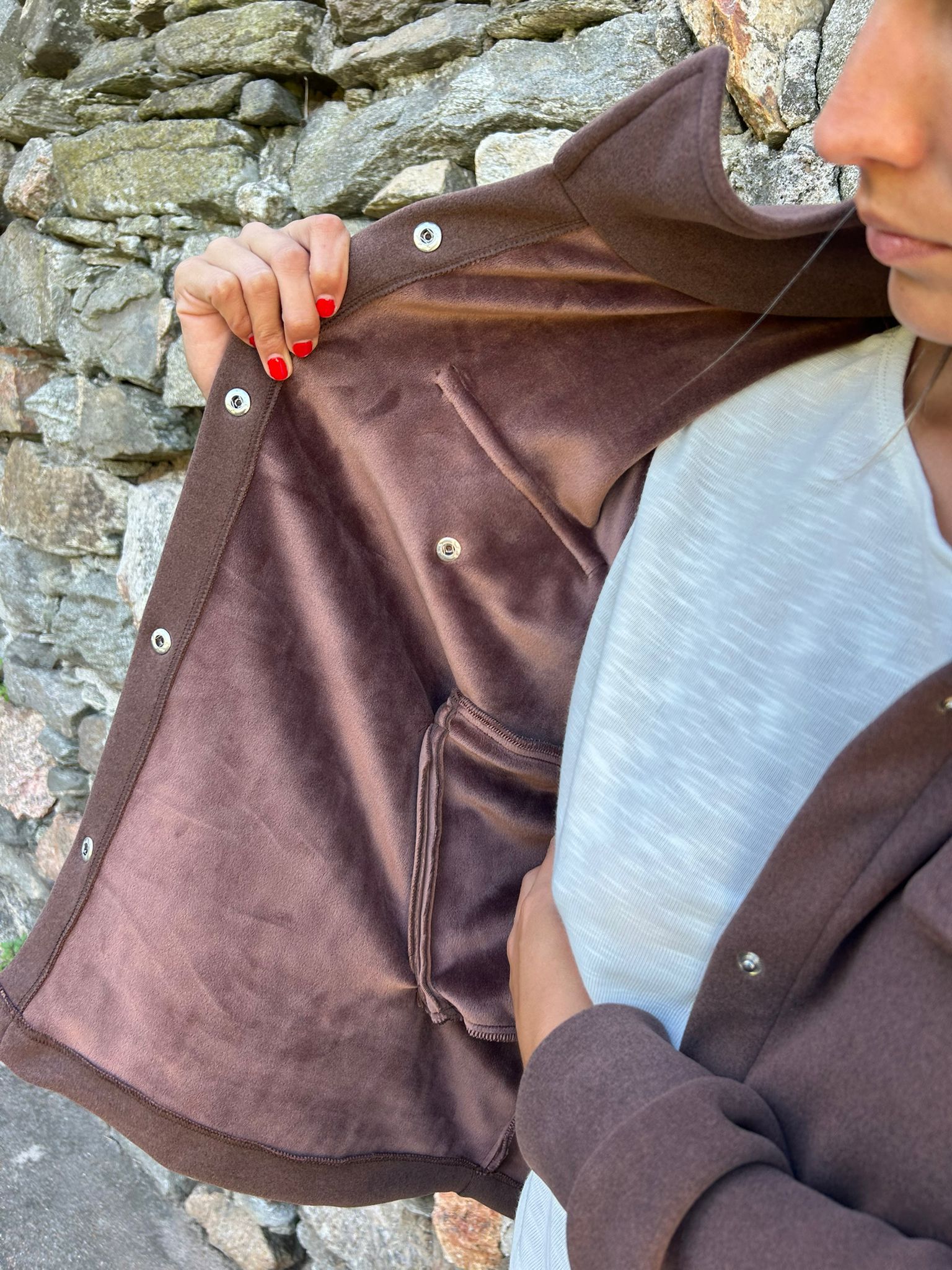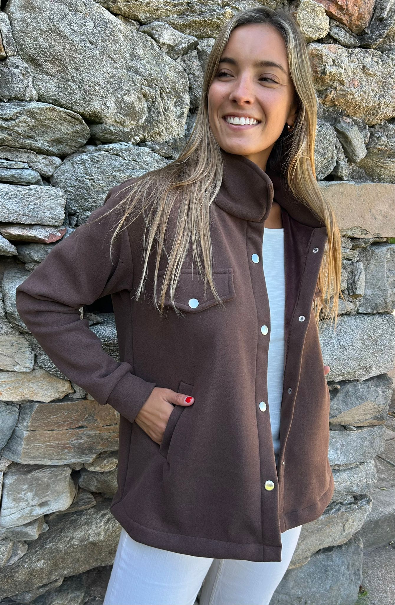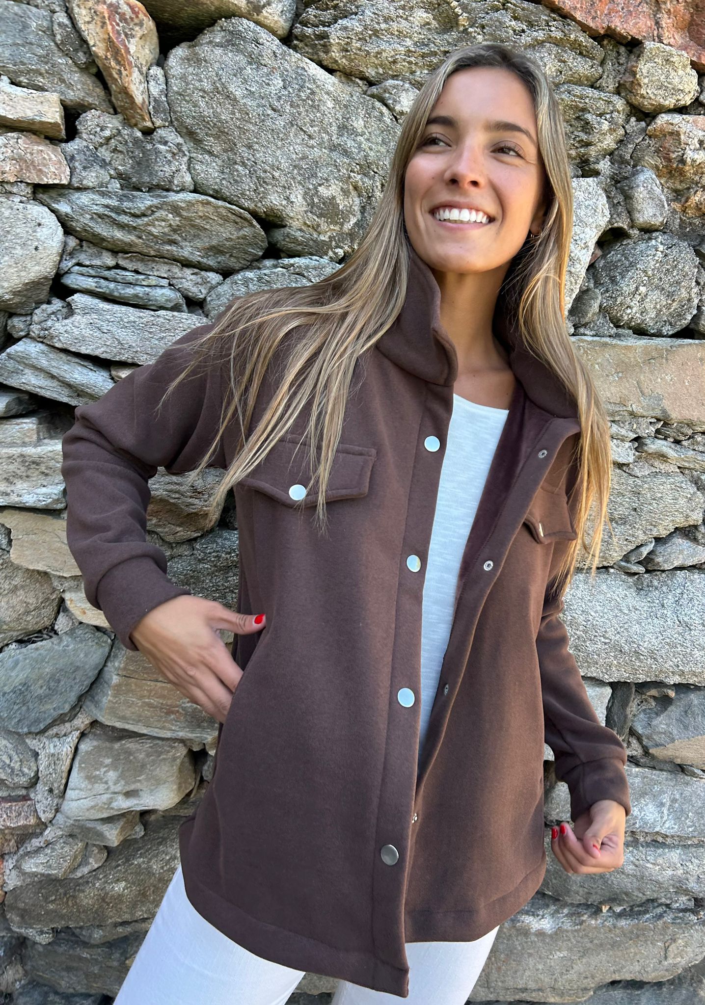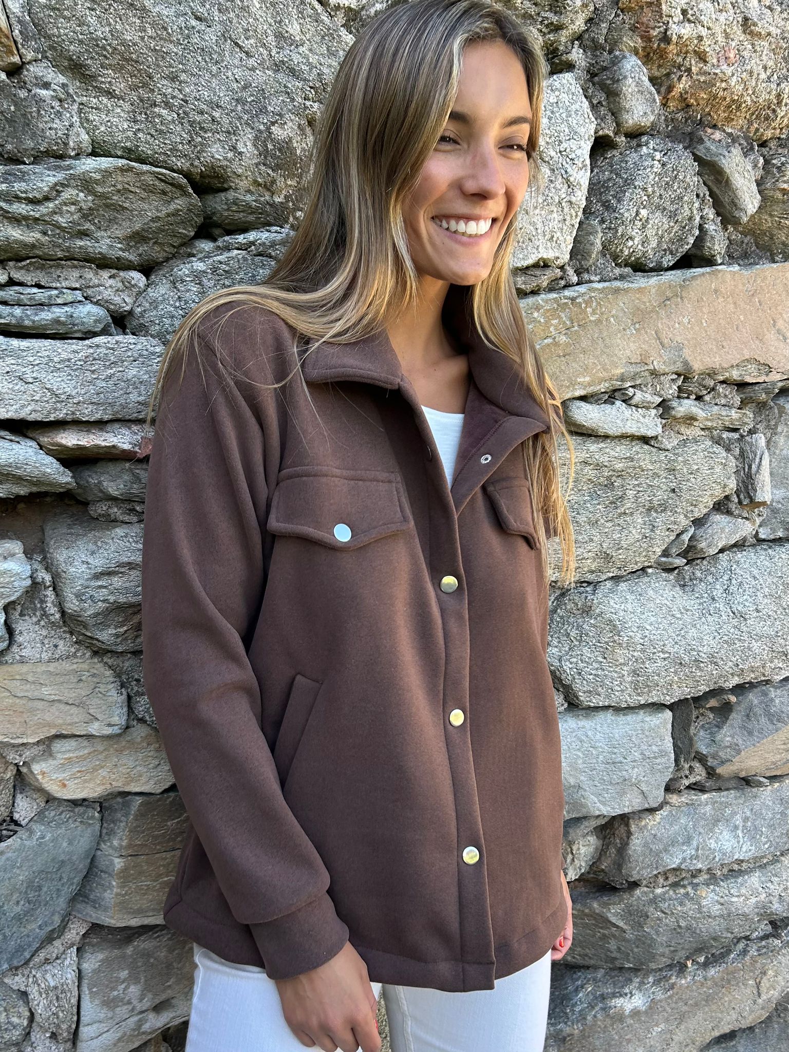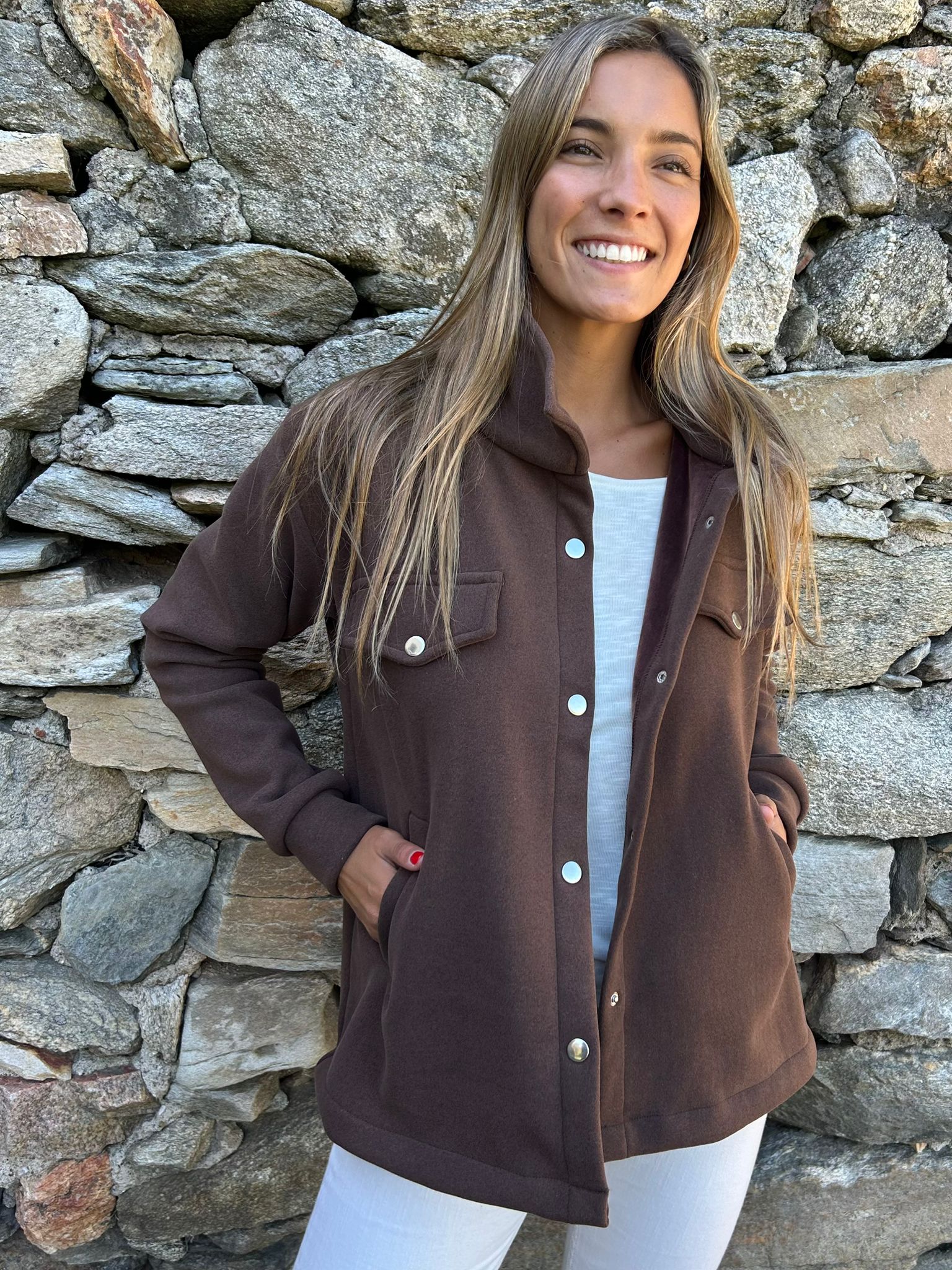 Chaqueta estilo camisa de piel teddy lisa con broches y bolsillos . Cómoda y calentita . Su material es muy suave , Una prenda súper versátil , le das un look informal o más formal , depende tus accesorios