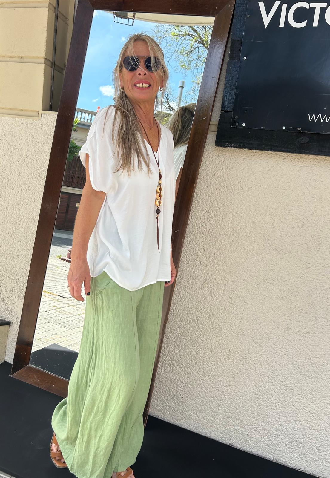 Pant de Lino con elástico en cintura pero al mismo tiempo tiene bolsillos laterales y pasa cintos. Tiene un corte en A que le da fluidez a su estilo .