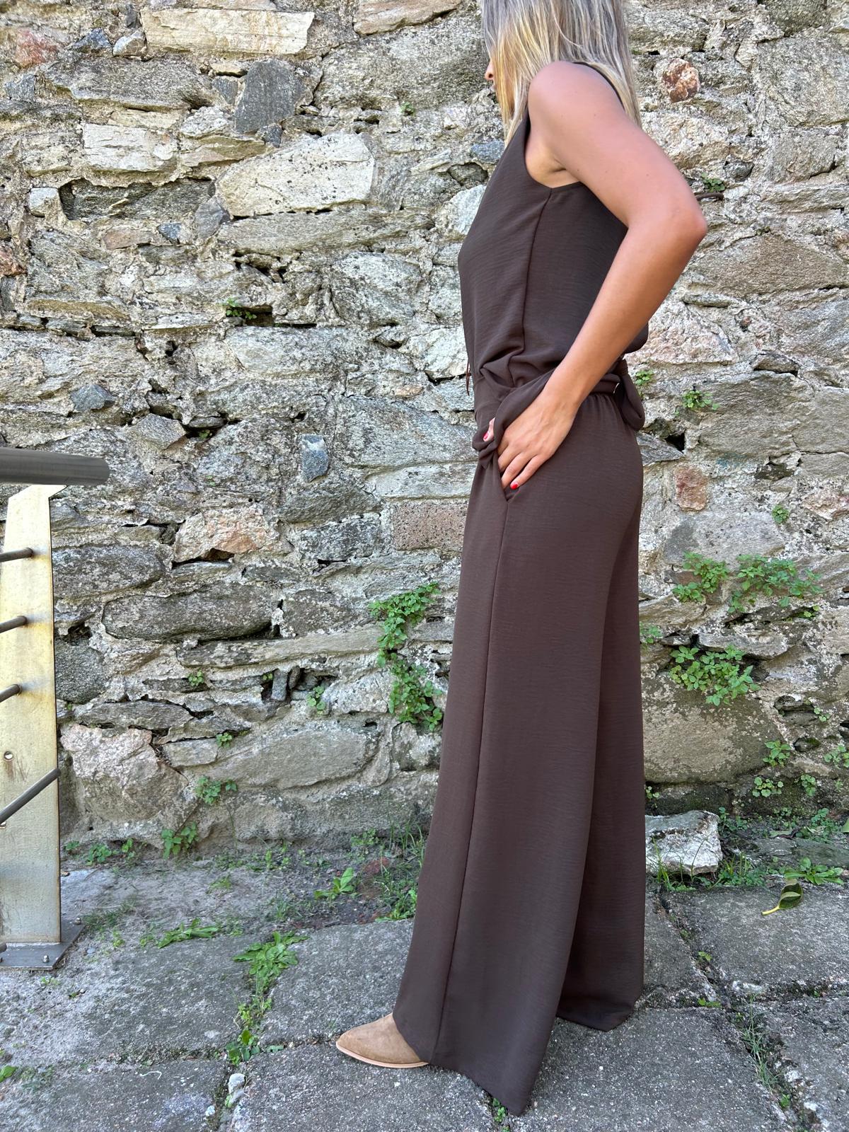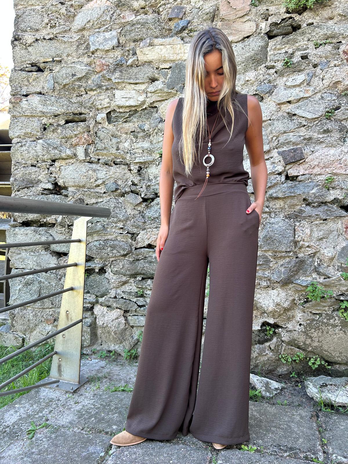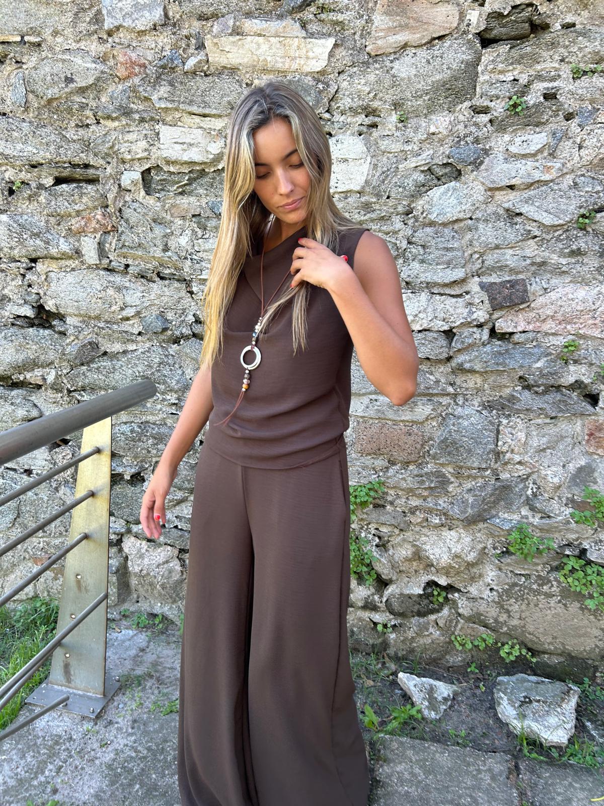 Pant chocolate , estilo corte Oxford . Comp : viscosa y lycra . Un Pant con estilo y movimiento . Pretina al frente y elástico atrás y con bolsillos laterales . Se acomoda a tu silueta por la caída de la tela .