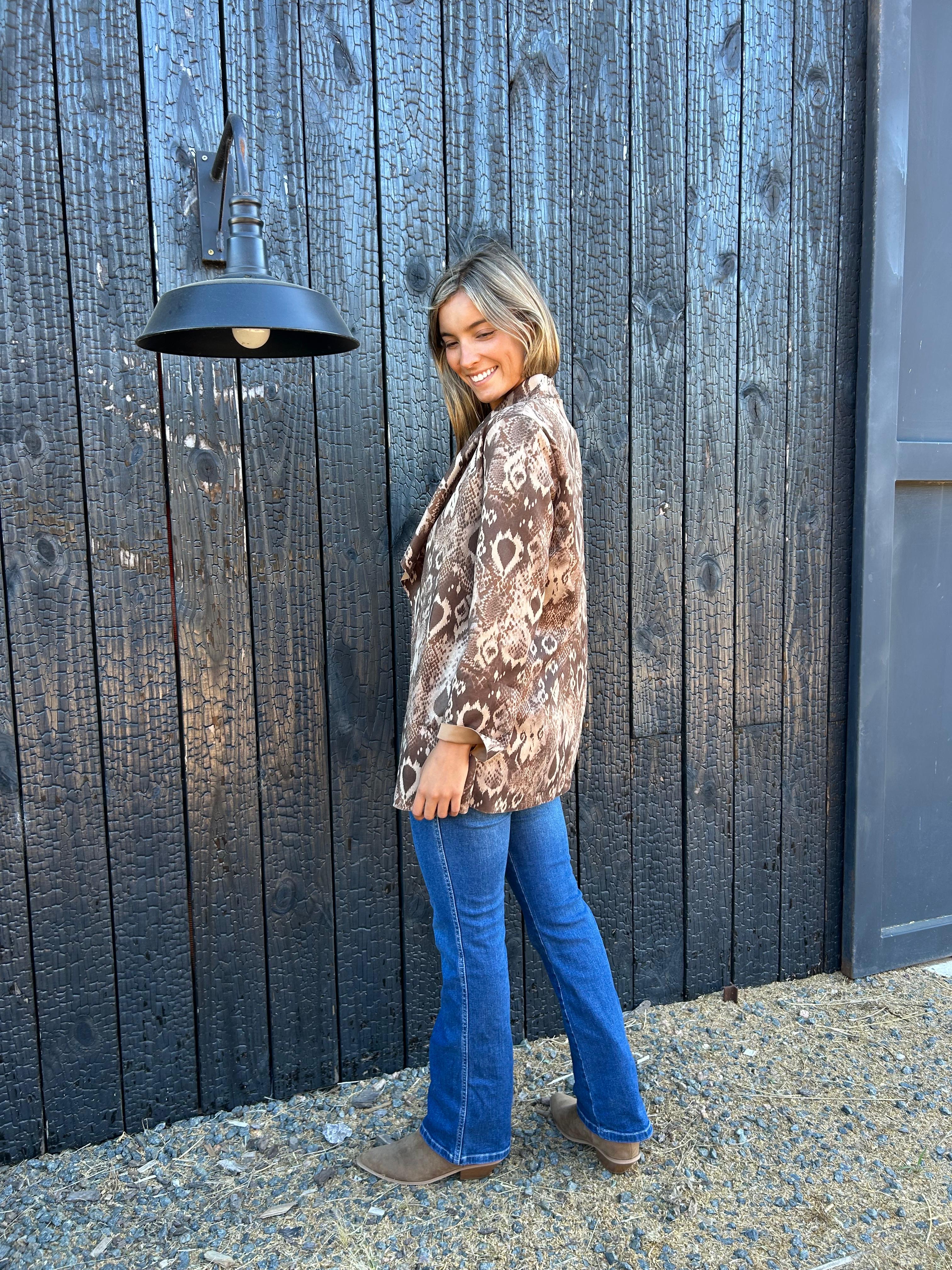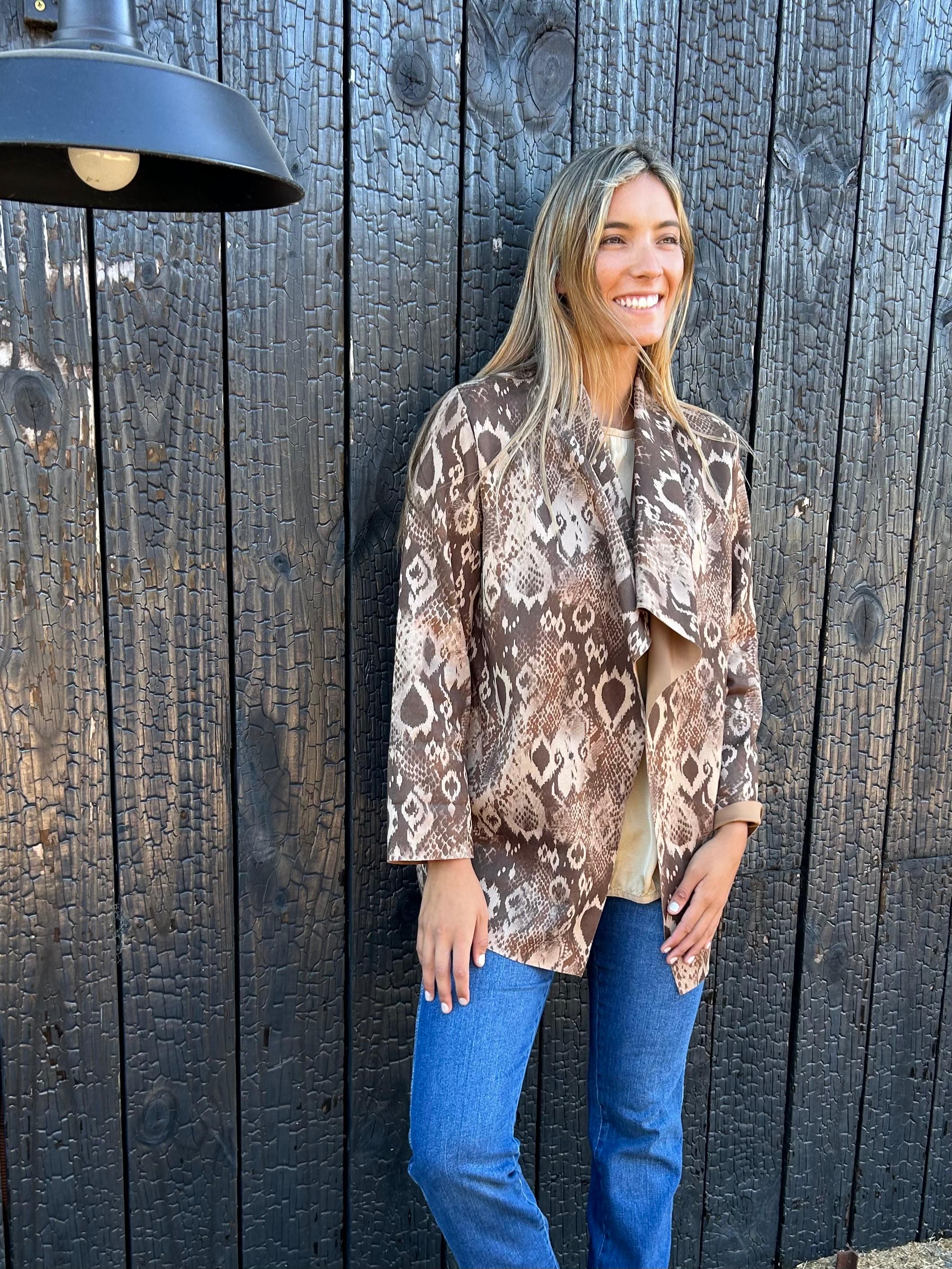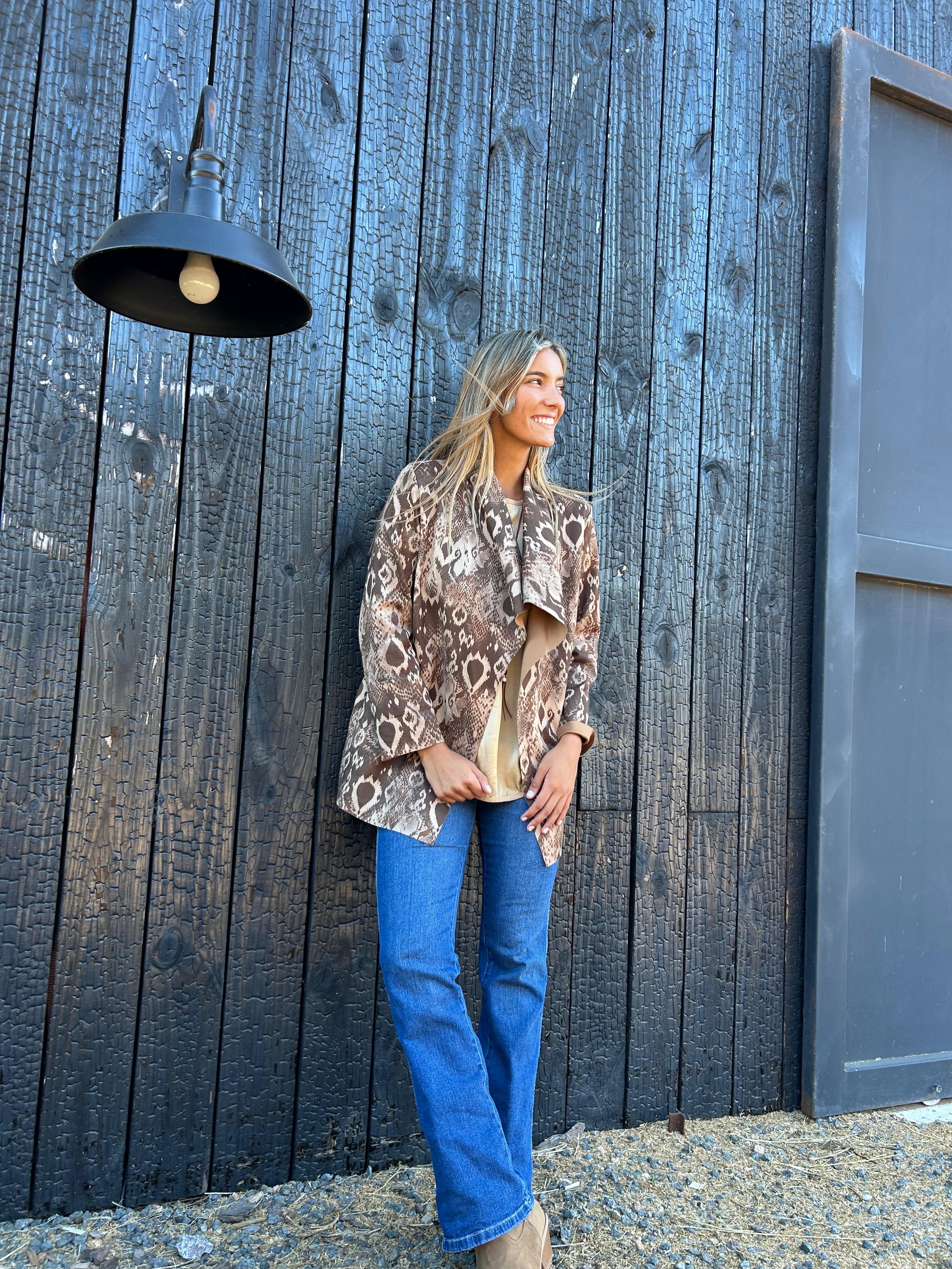 Parka piel estampada colores marrones y celeste jean. Con bolsillos laterales. Una parka estilo chaqueta, para cualquier estación. Un toque elegante y sofisticado a tu look. Super cómoda se adapta a tu silueta. Composición: algodón, spandex y poliamida. Cápsula exclusiva lanzamiento.
