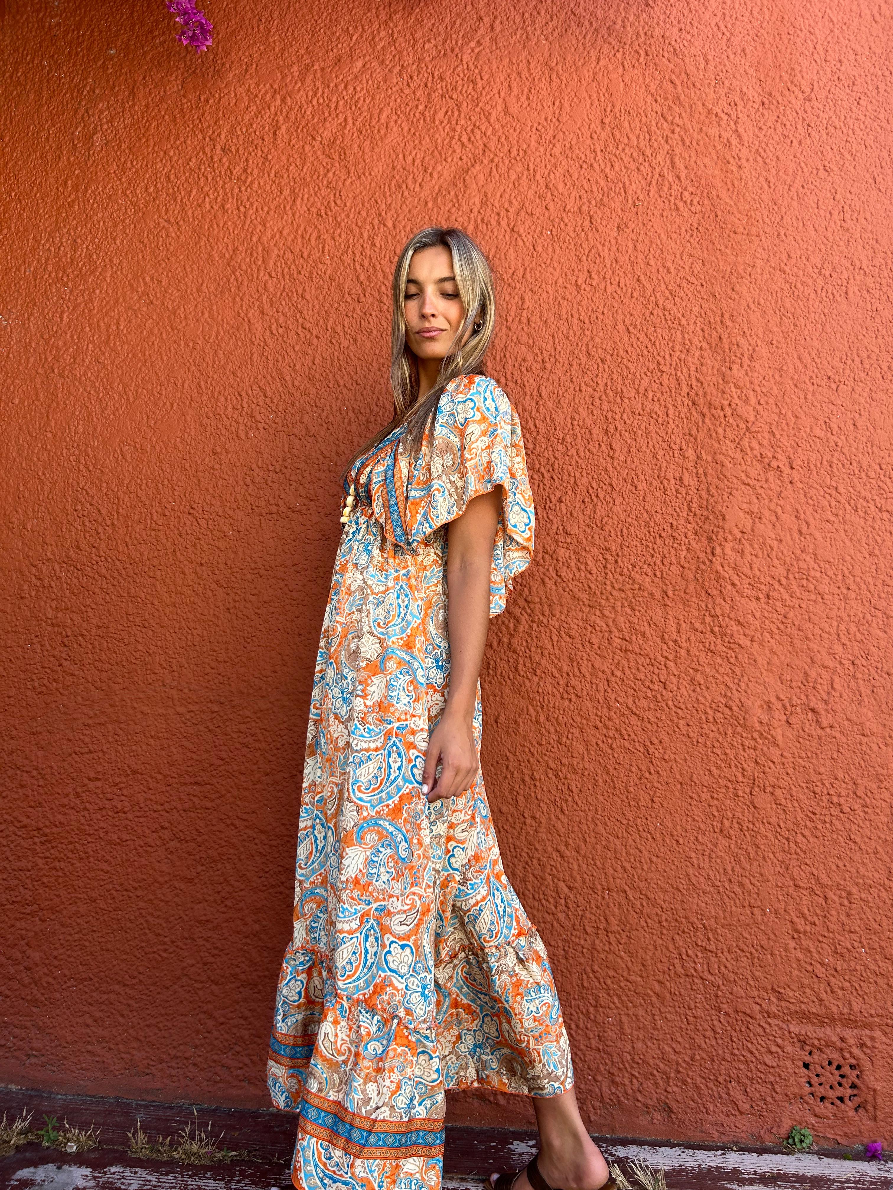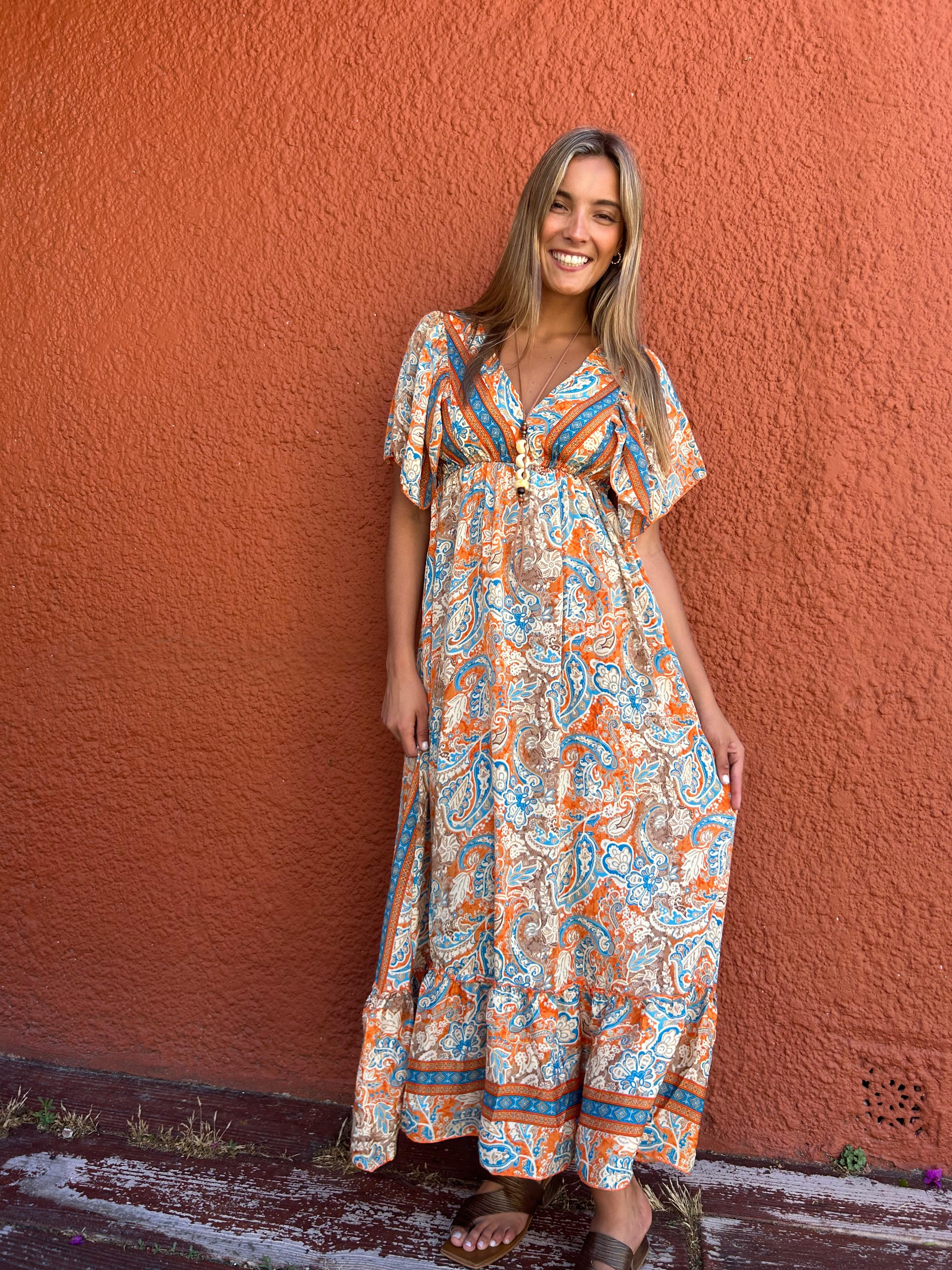 Vestido Boho chic, versión 2026.Mangas 3/4 de seda, fluido y versátil con botas o sandalias.