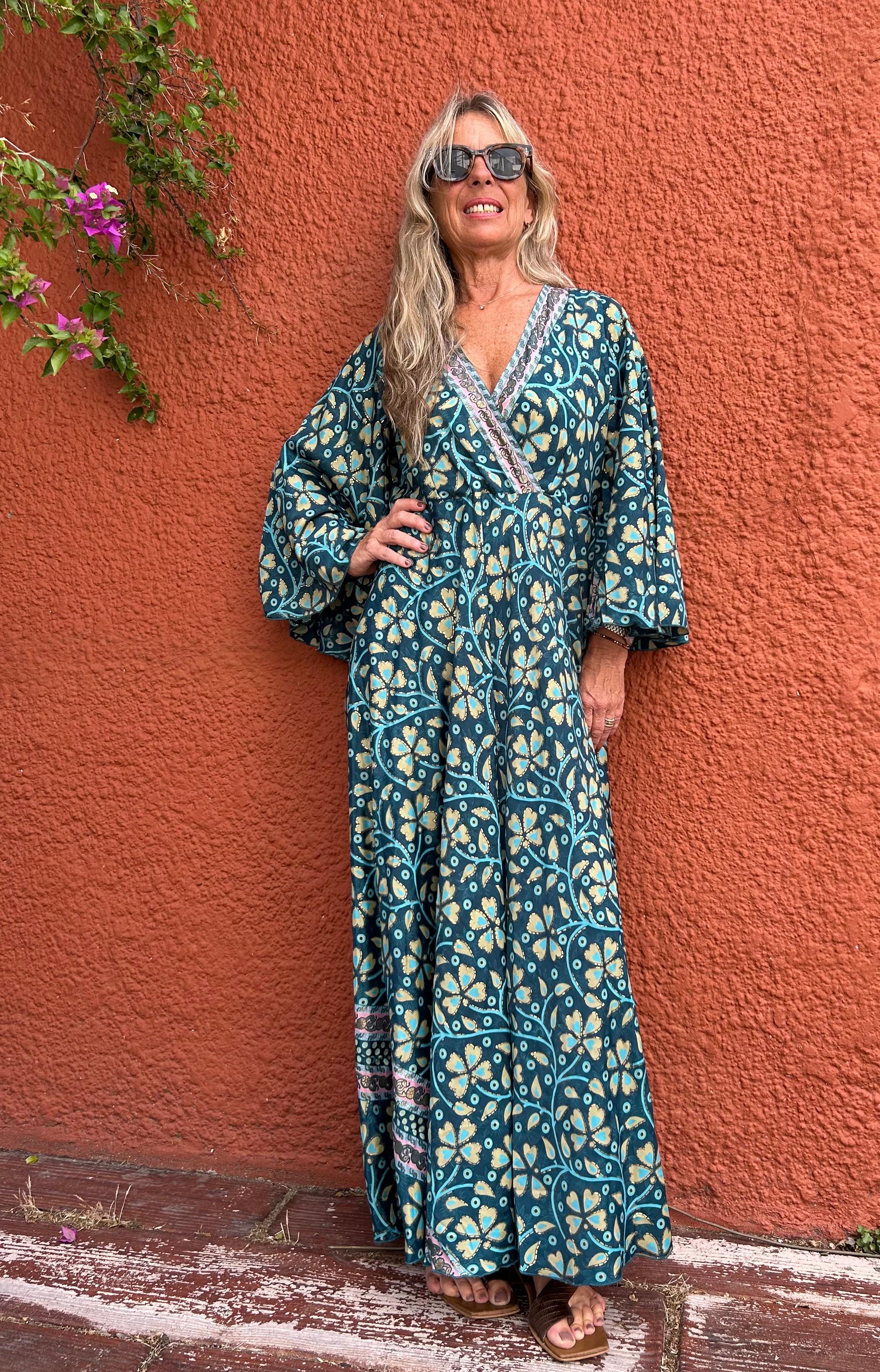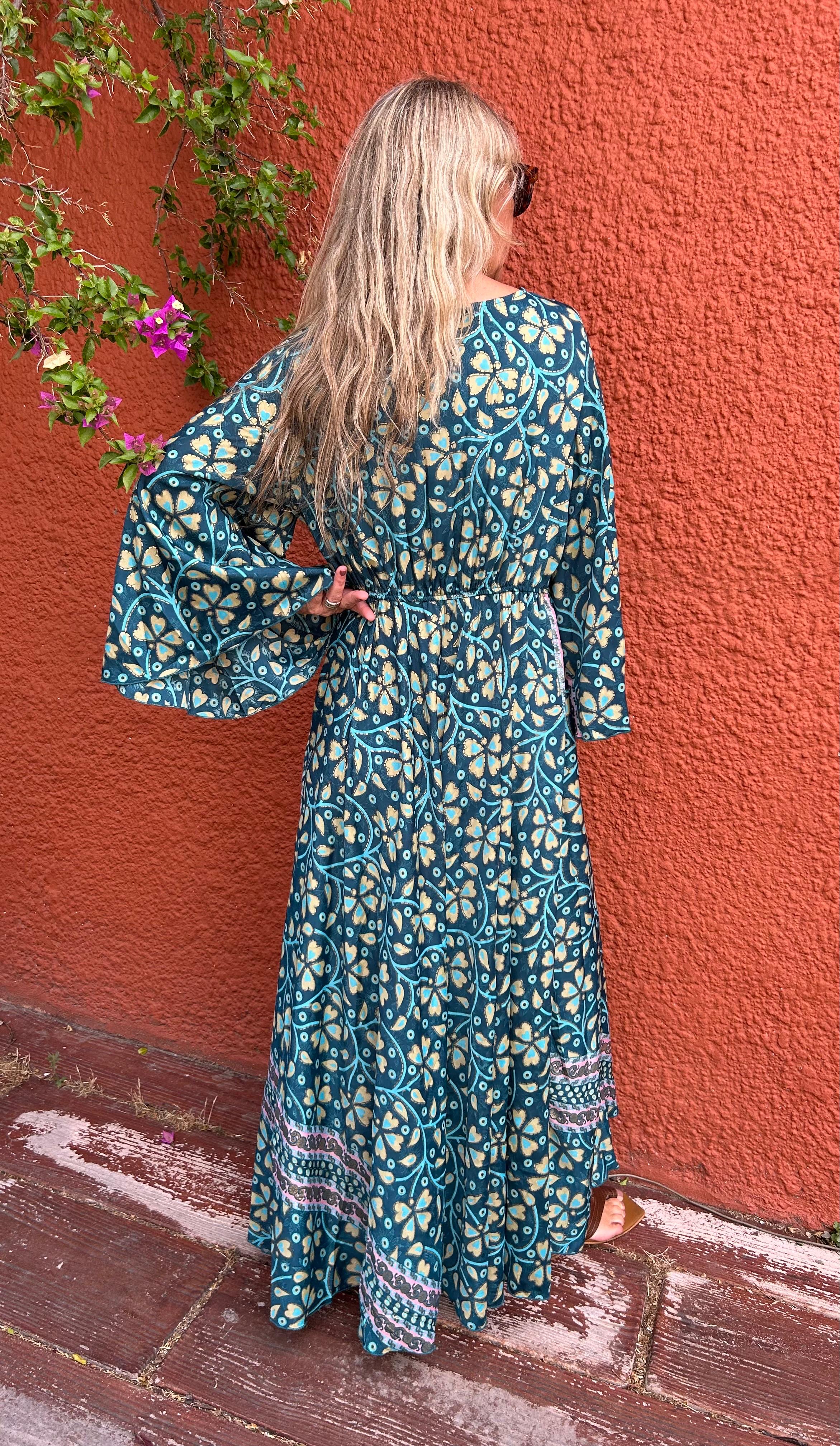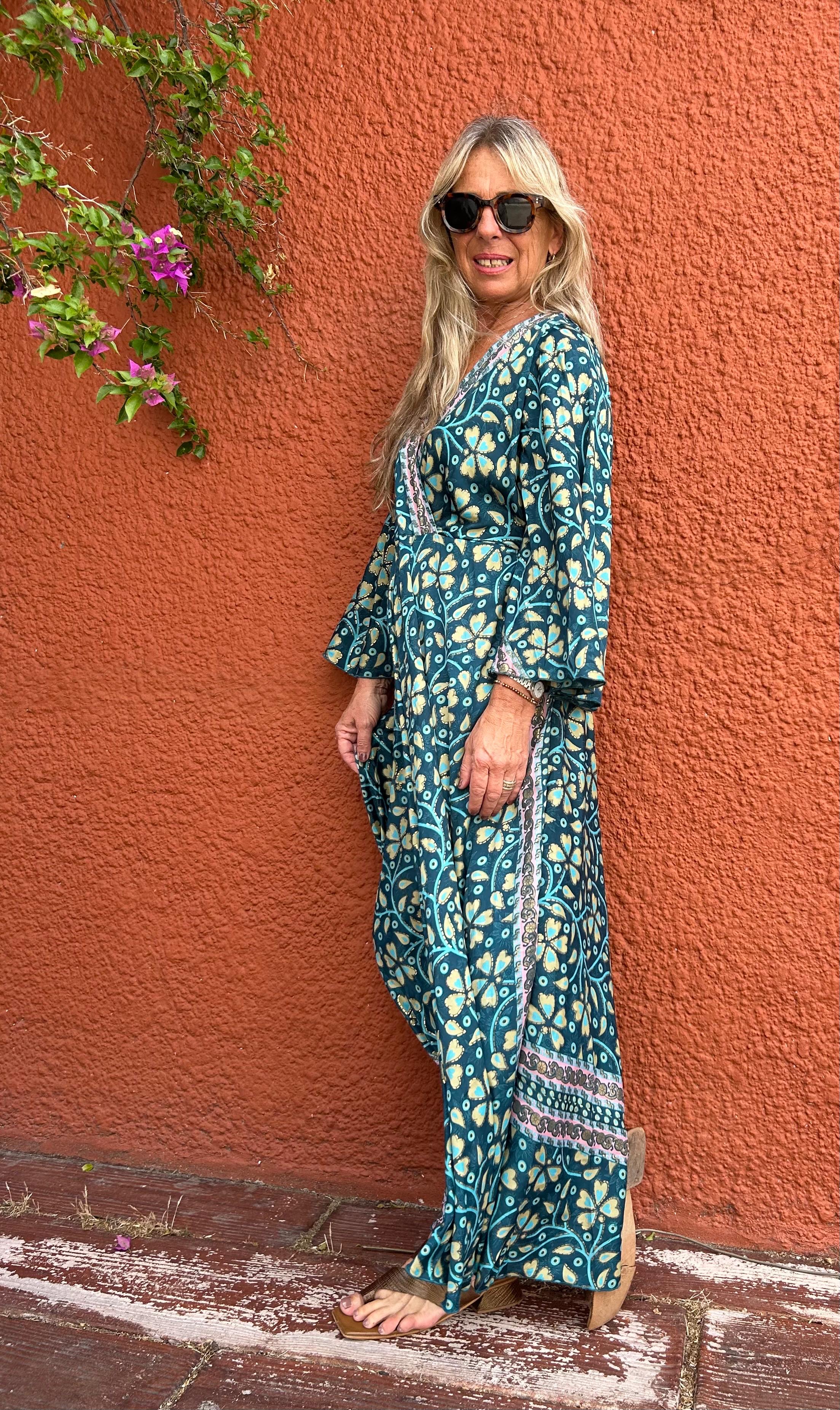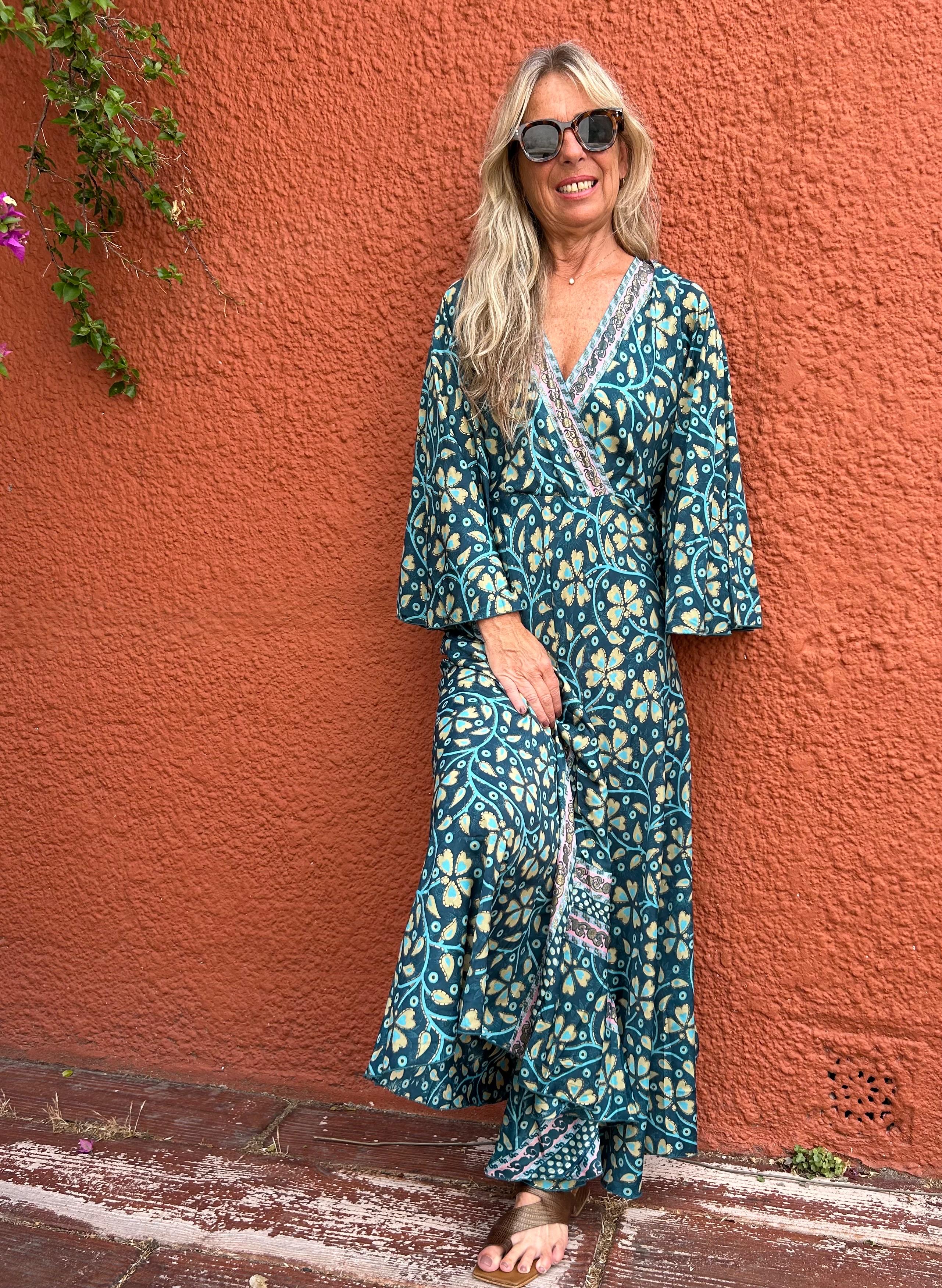 Vestido Boho chic, versión 2026.Mangas 3/4 de seda, fluido y versátil con botas o sandalias.