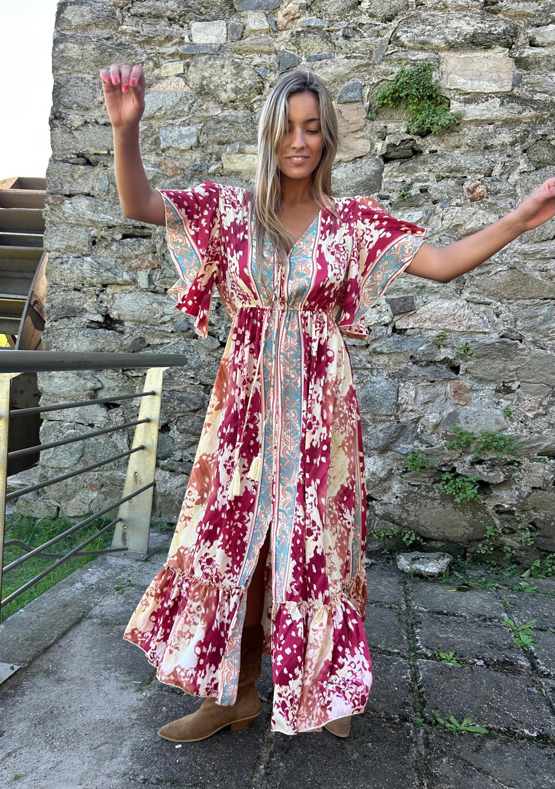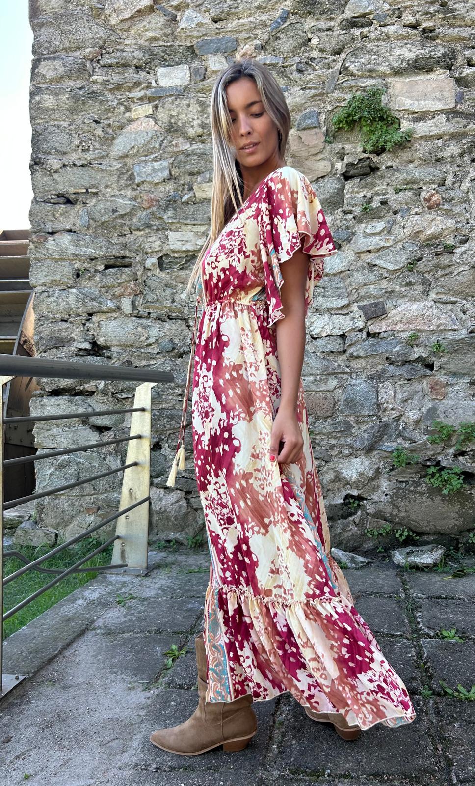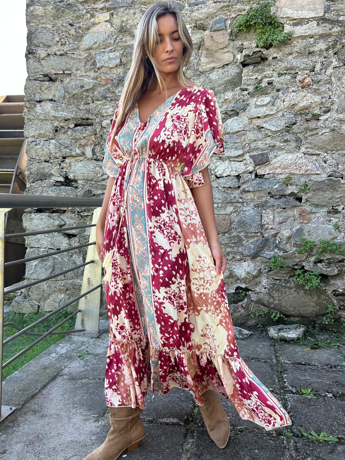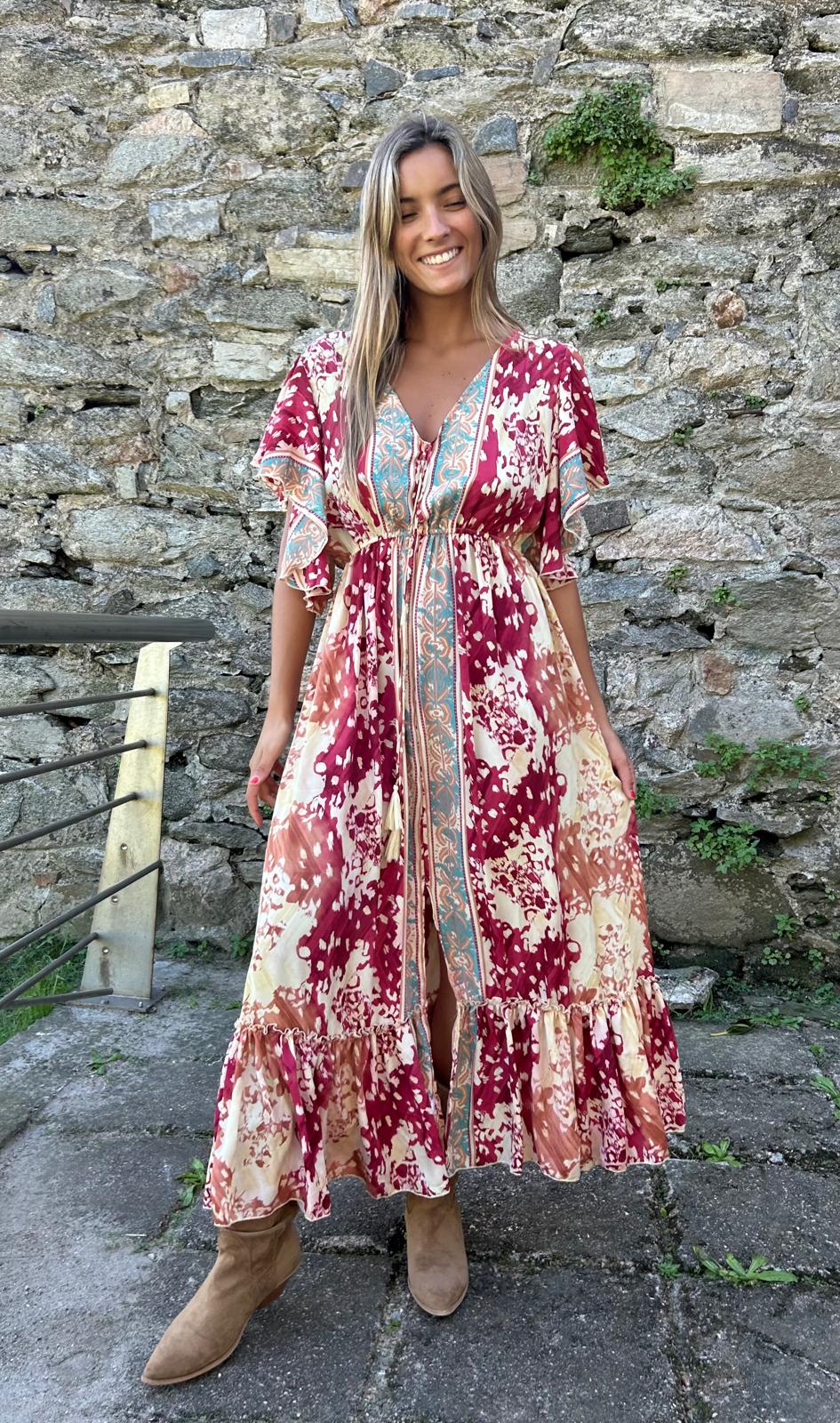 Vestido Boho chic, versión 2026.Mangas 3/4 de seda, fluido y versátil con botas