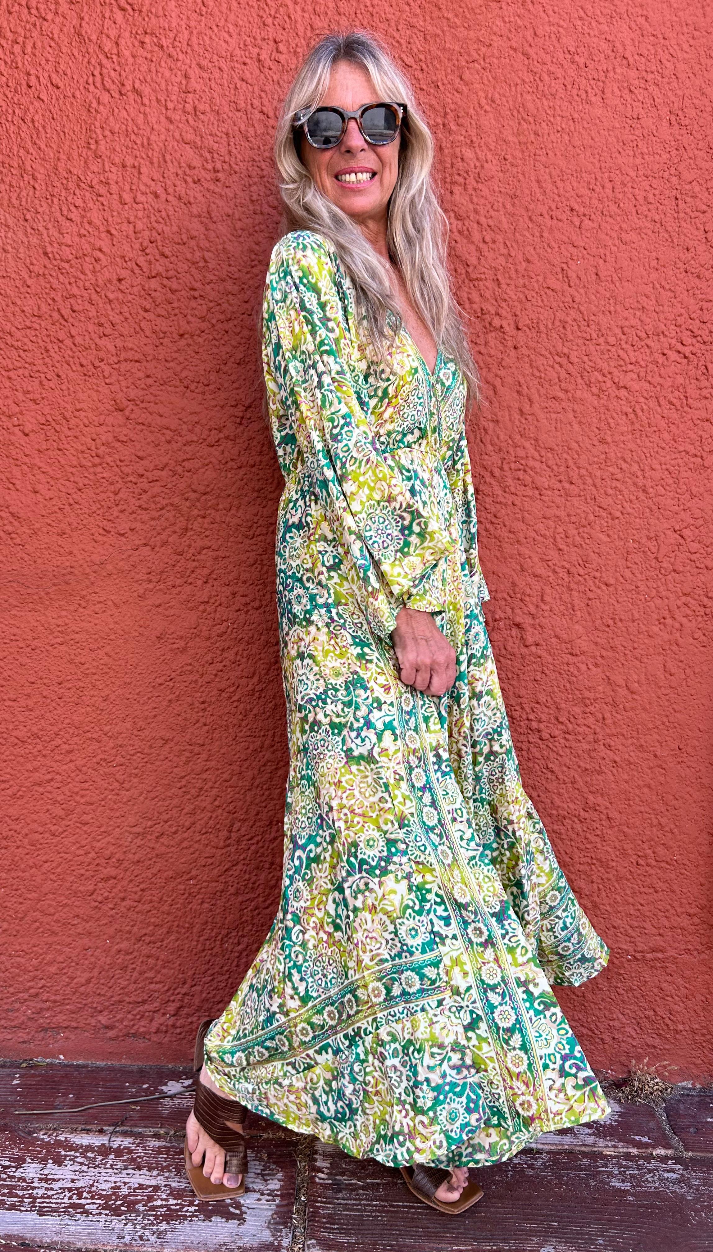 Vestido Boho chic, versión 2026.Mangas 3/4 de seda, fluido y versátil con botas o sandalias.